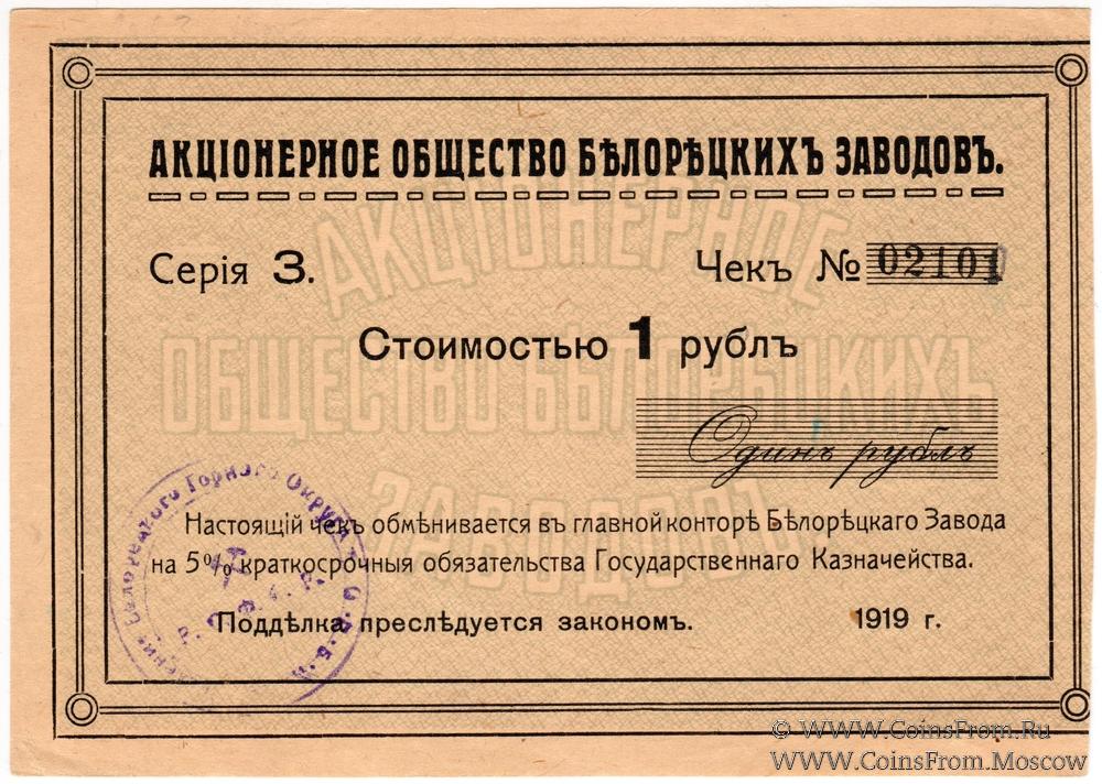 Чек 1919 г. Выпуск 1. Большой формат. Серия З. Печать Правления. Акционерное Общество Белорецких Заводов.