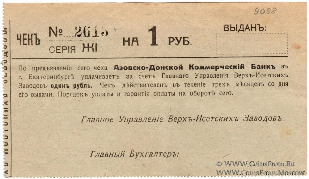 Чек без даты. Серия ЖI. Бланк с номером. Азовско-Донской Коммерческий Банк за счет Главного Управления Верх-Исетских заводов.