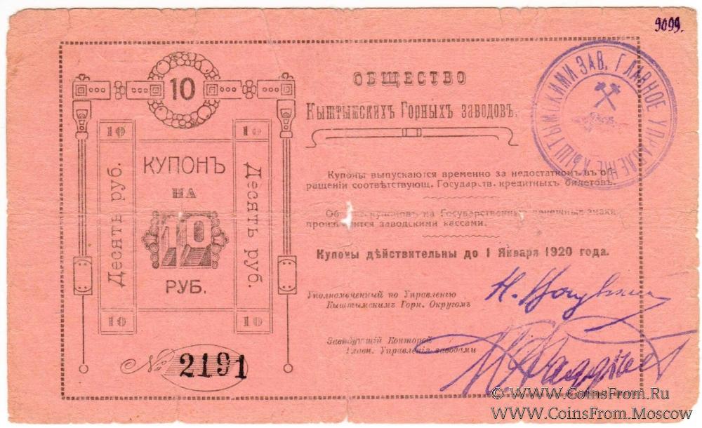 Купон без даты (1919 г.). 2-й выпуск. Действителен до 1 января 1920 г. Номер 4-значный. Общество Кыштымских Горных Заводов.