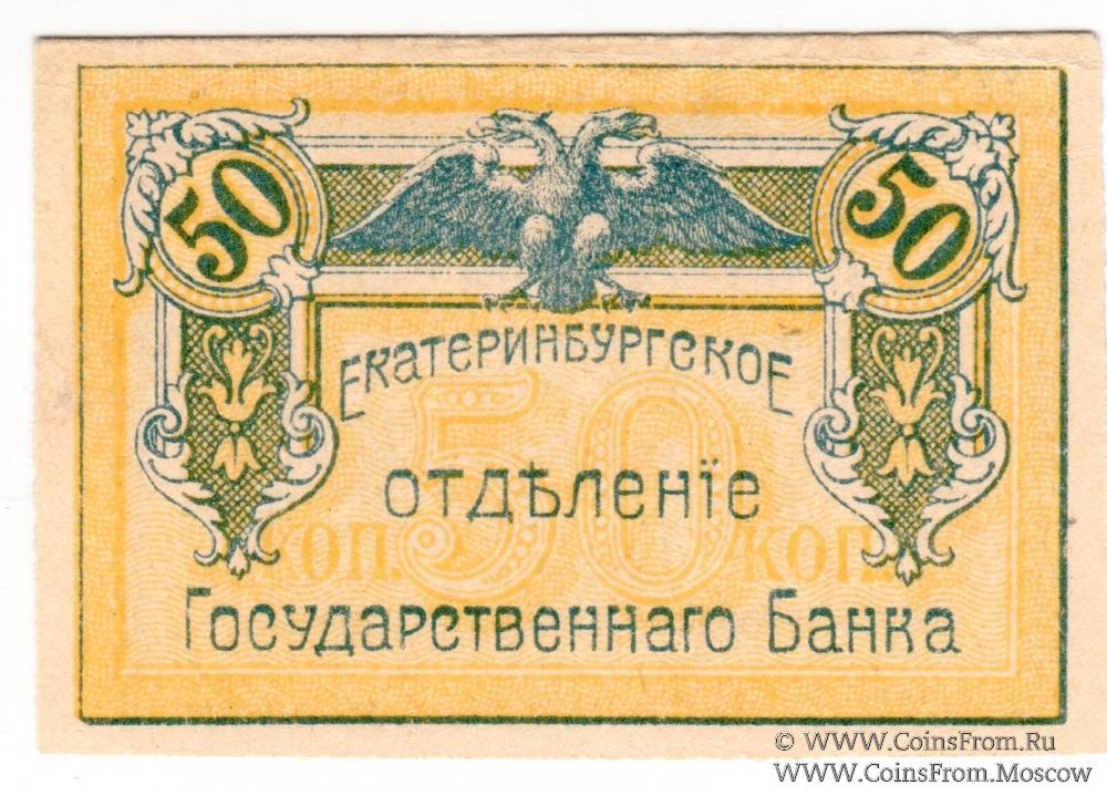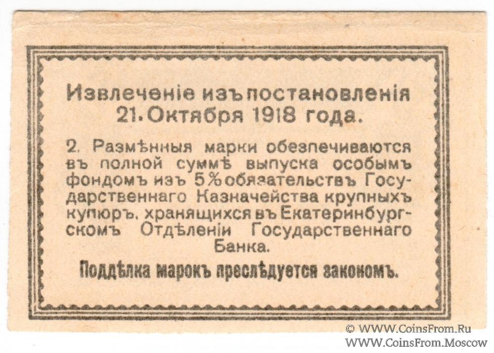 Разменная марка 1918 г. Лимонный цвет аверса. Екатеринбургское Отделение Государственного Банка.