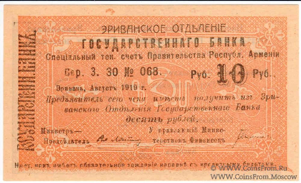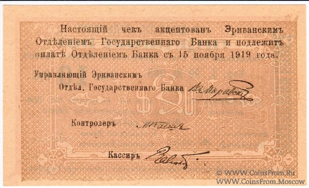 Малой формы, двусторонний. Серия З. Оранжево-коричневый фон. Чек. Август 1919 г. Срок 15.11.1919 г. Эриванское Отделение Государственного Банка.