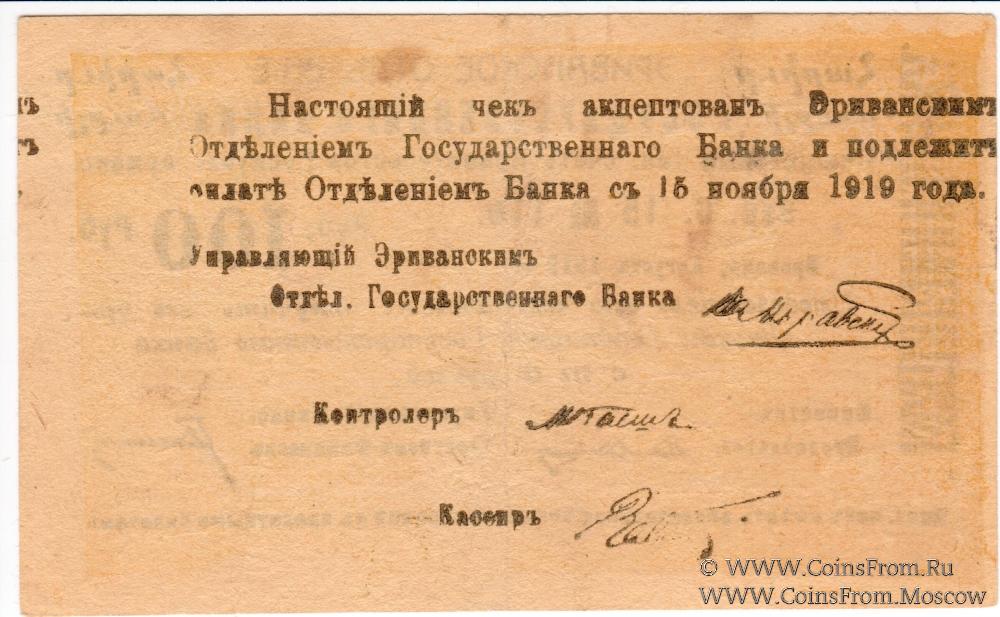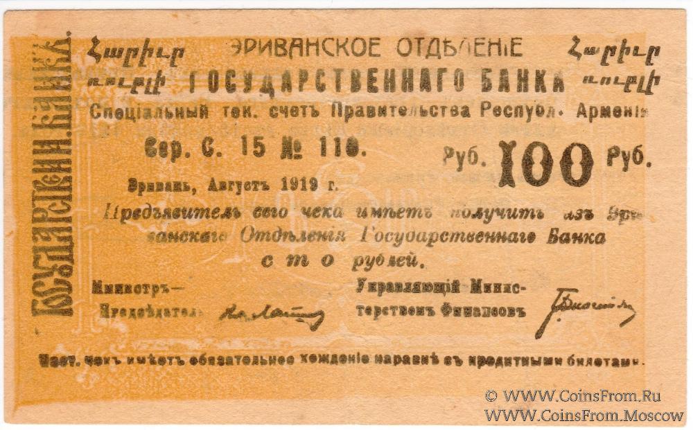 Малой формы, двусторонний. Серия C. Жёлтый фон. Чек. Август 1919 г. Срок 15.11.1919 г. С армянским текстом на аверсе. Эриванское Отделение Государственного Банка.