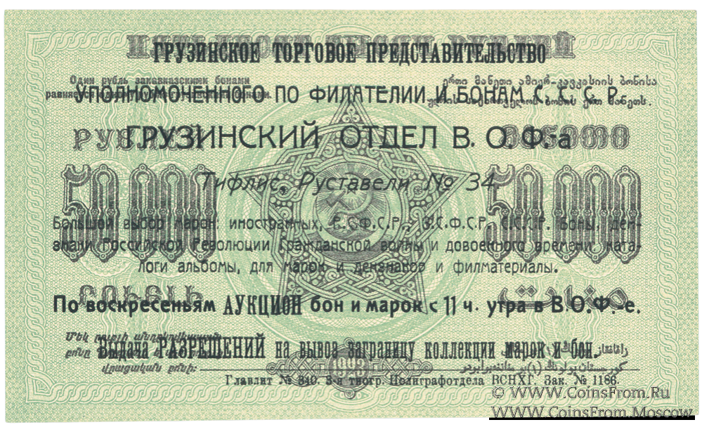 Надпечатка: "Грузинское торговое представительство уполномоченного по филателии и бонам С.С.С.Р. Грузинский отдел В.О.Ф.-а. Тифлис, Руставели № 34. Большой выбор марок: иностранных, РСФСР, ЗСФСР, СССР, Боны, дензнаки Российской Революции Гражданской войны и довоенного времени: каталоги альбомы для марок и дензнаков и филматериалы. По воскресеньям аукцион бон и марок с 11 ч. утра в В.О.Ф.-е. Выдача разрешений на вывоз заграницу коллекции марок и бон.".