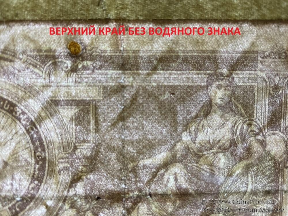 Денежный знак 1924 г. БРАК (ПРОБА) печати: увеличенного размера; на аверсе фоновый коричневый рисунок (1 прогон); сверху полоса без водяного знака (край листа). Водяной знак - звезды.