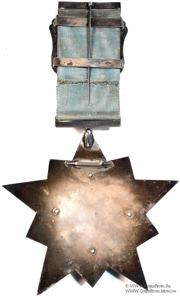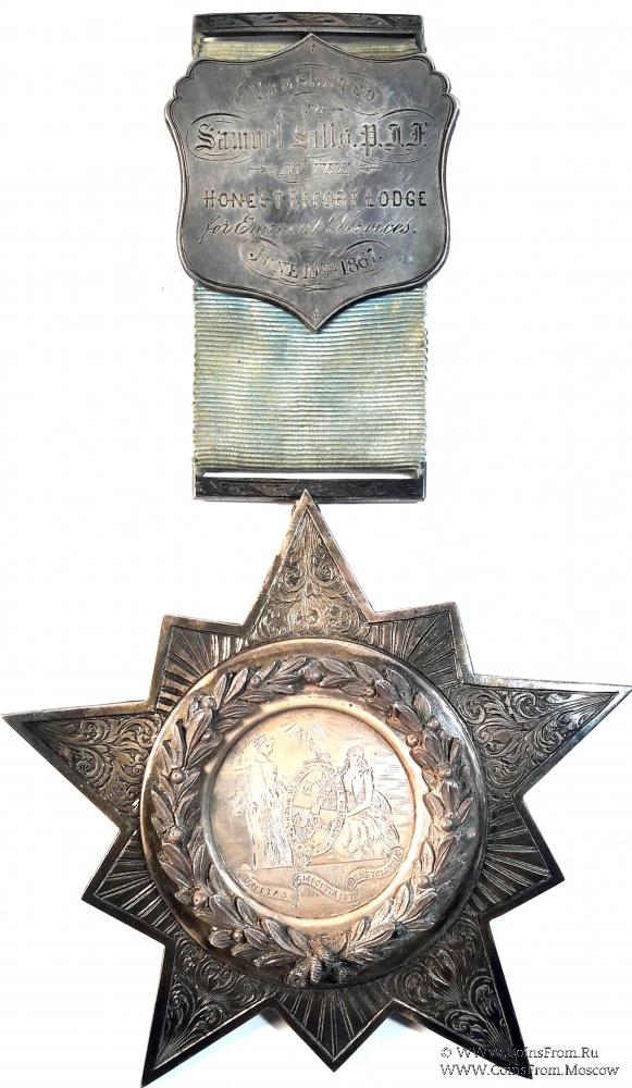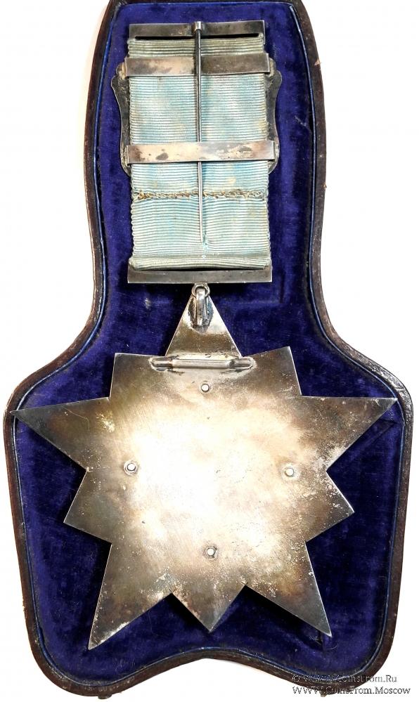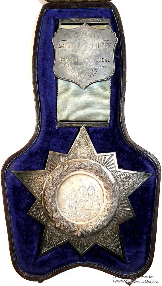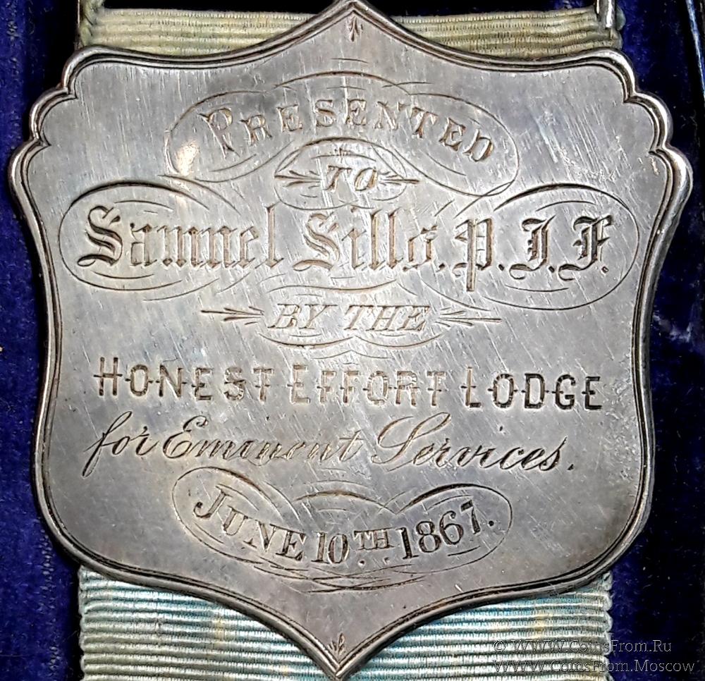 Знак на ленте небесно голубого цвета. Судя по цвету ленты знак Ложи Цехового (Символического) масонства. Верхняя и нижняя колодки прямоугольной формы с прорезями для ленты и украшены чеканкой. В верхней части ленты медальон с надписью: Presented to Samuel Sillo PJF by the Honest Effort Lodge for Eminent Services June 10TH 1867 – Вручено Samuel Sillo PJF от Honest Effort Ложи за выдающиеся услуги. 10 июня 1867 г.