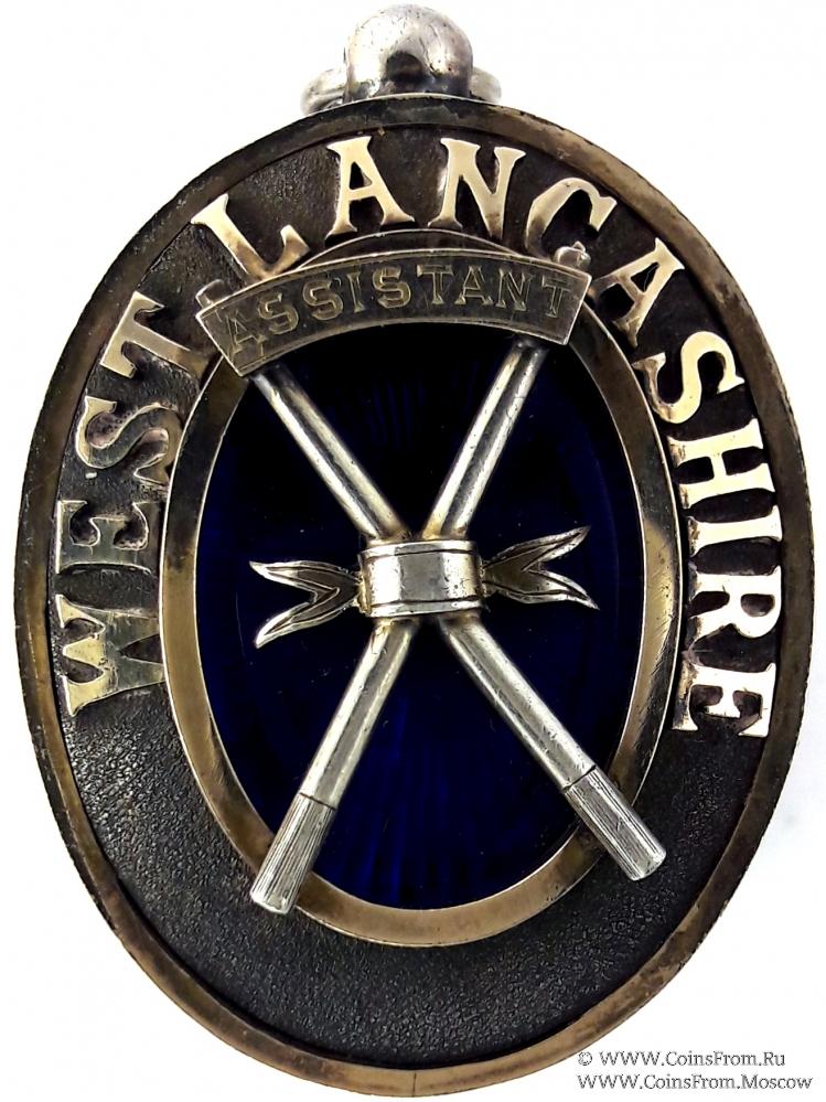 Знак овальной формы местами жёлтого цвета в центре на синем фоне два перекрещенных жезла перевитых лентой. В верху лента с надписью ASSISTANT-помощник. В верху название провинции WEST LANCASHIRE. Знак старого выпуска 1912 г. в более поздних знаках утверждено, что надпись помощник должна быть в низу.