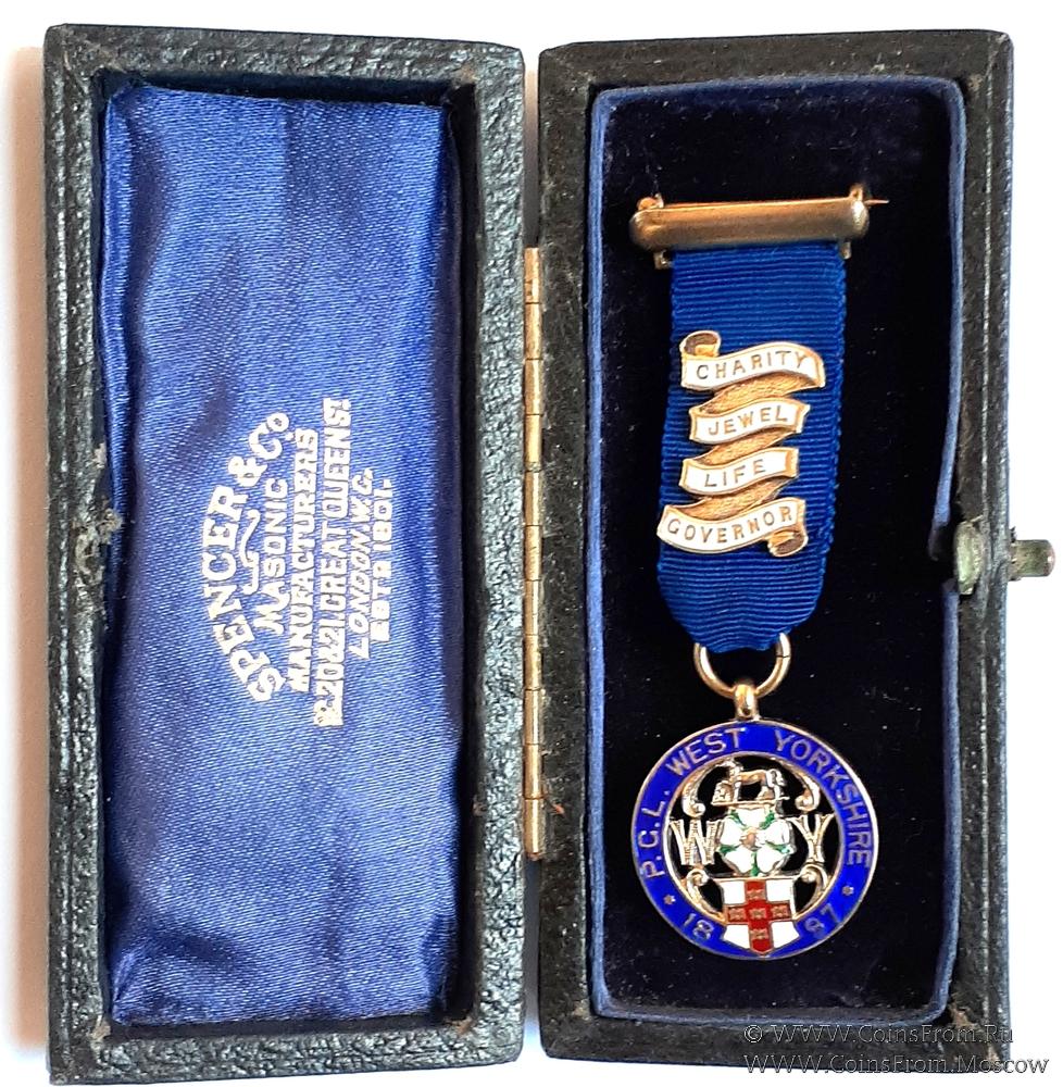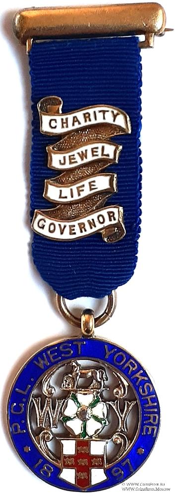 АВЕРС: круг синей эмали с наименованием и датой образования Ложи: P.G.L. West Yorkshire 1897 – Провинциальная Великая Ложа Западного Йоркшира 1897. Внутри круга белая роза («Роза Йорков»), по бокам буквы W.Y. (West Yorkshire). Ниже розы малый герб Йорк Сити в виде щита. Над розой изображение коня в профиль. Диаметр знака 24 мм.