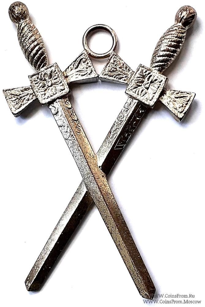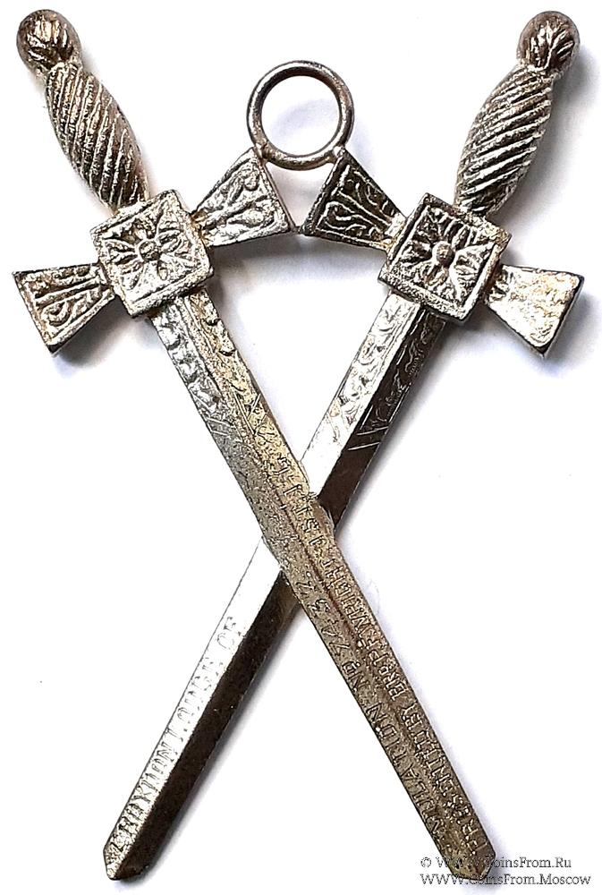 Знак: основной металл, покрытие. Аверс: в форме перекрещенных мечей. Реверс: клейма нет. Гравировка: Presented by W. Bro. F.F. Wright Ist. I.G. Croydon Lodge of Emulation № 7437 – Представлен Брат F.F. Wright Ложей Croydon Lodge of Emulation № 7437. Колодки: нет. Лента: знак носится на голубой ленте.