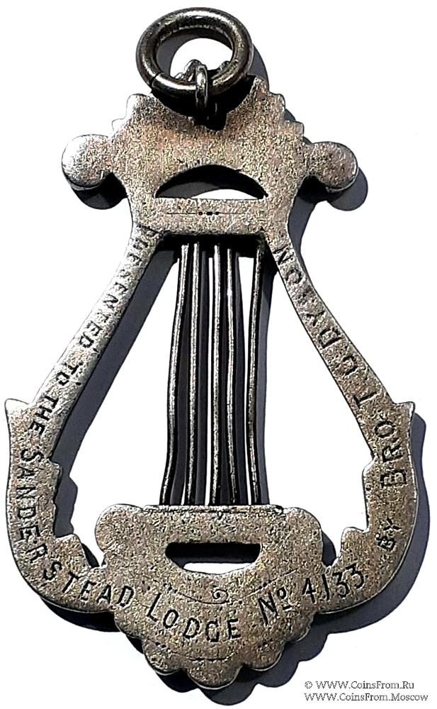 Знак: основной металл, покрытие. Аверс: в форме лиры. Нижняя часть украшена орнаментом. Реверс: клейма нет. Гравировка: Presented to the Sander Stead Lodge № 4133 by Bro. T.O. Dyson – Представлен Брат T.O. Dyson в Ложе Sander Stead Lodge № 4133. Колодки: нет. Лента: знак носится на голубой ленте.