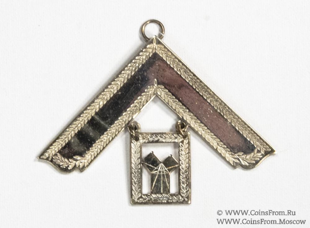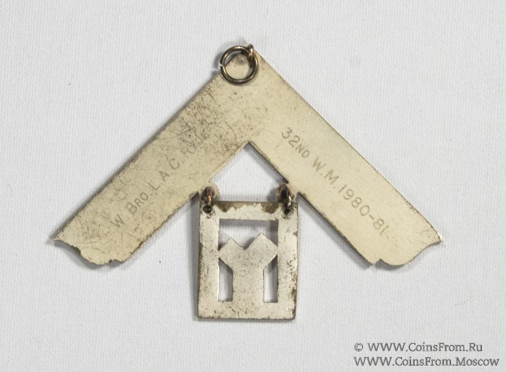 Наугольник с подвеской квадратной формы в которой символическое изображение 47 задачи Евклида. (теорема Пифагора). Гравировка на реверсе: W. BRO (уважаемый брат). JOHN ALEXANDER MUSTARD MASTER (мастер) 1958-59.