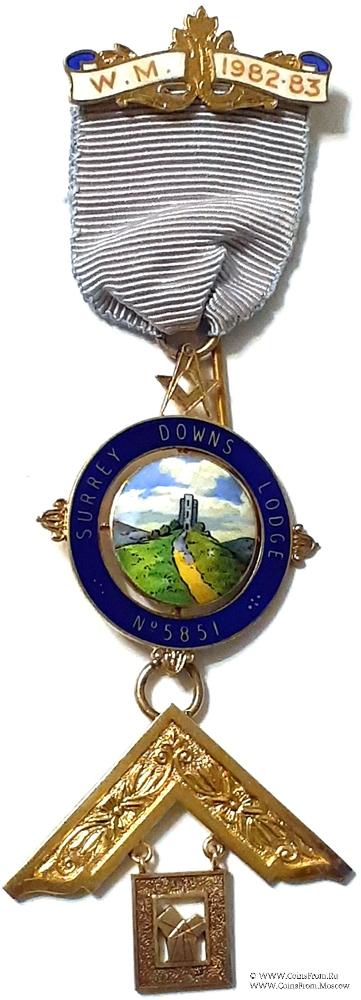 АВЕРС: в форме наугольника с подвеской квадратной формы, отображающей символическое изображение чертежа к 47 теореме из первой книги Евклида (теорема Пифагора). Стороны наугольника равноценные с орнаментом, который находится в углублении. Верхняя подвеска круглой формы с наименованием и номером Ложи (Surrey Downs Loge № 5851). В центре на выпуклой вставке рисунок по эмали. Верх подвески украшен циркулем с наугольником, к которому крепится кольцо ленты.