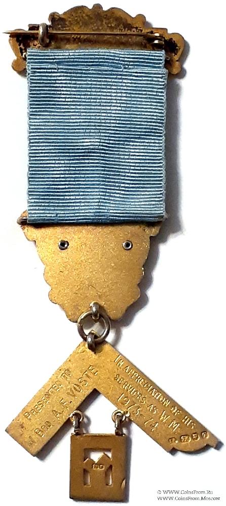 РЕВЕРС: гравировка: Presented to W.Bro. A.F. Voste in Appreciation of his Services as W.M. 973-74. Клейма: на наугольнике - Е.Р., лев, голова леопарда, q (1971), на подвеске – лев, голова леопарда.