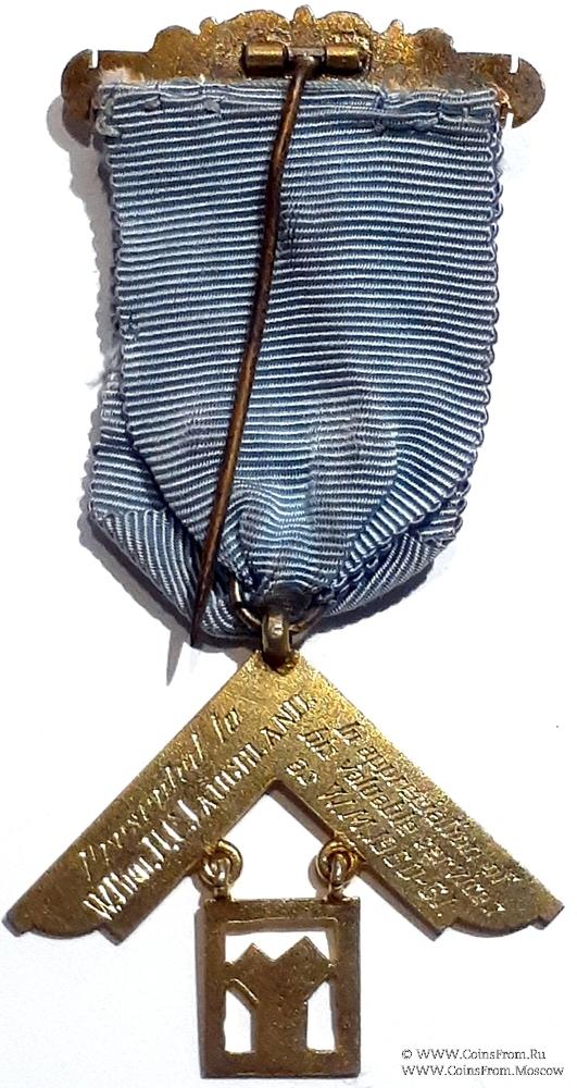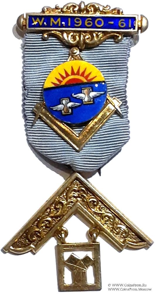 КОЛОДКИ/МЕДАЛЬОН: верхняя колодка прямоугольная, украшенная снизу и сверху орнаментом. Надпись – W.M. 1960-61. На ленте медальон в форме циркуля с наугольником и накладного круга с рисунком на эмали. На синем фоне двое песочных часов с крыльями и восходящее солнце на жёлтом фоне.