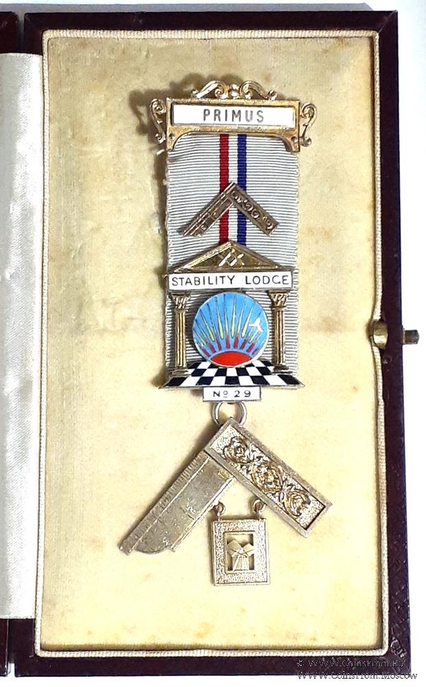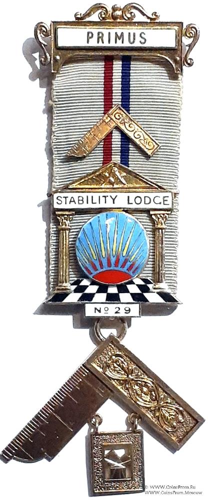 АВЕРС: знак из двух частей. Нижняя часть - в форме наугольника с подвеской квадратной формы, отображающей символическое изображение чертежа к 47 теореме из первой книги Евклида (теорема Пифагора). Одна часть наугольника с изображением орнамента, другая с делениями. Верхняя часть в форме стилизованного здания Ложи с двумя символическими колоннами, чёрно-белым полом и фронтоном крыши с наименованием Ложи - Stability Lodge, и изображением наугольника и циркуля. В центре рисунок по эмали круглой формы с изображением восходящего солнца. Ниже клетчатого пола на белом прямоугольнике номер Ложи – № 29.