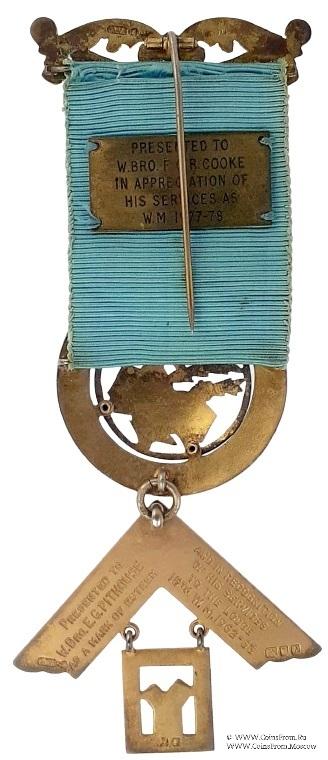 РЕВЕРС: клейма: наугольник – CW&S, лев, голова леопарда, n (1963), подвеска - лев, голова леопарда, верхняя колодка - CW&S, лев, голова леопарда. Гравировка: Presented to W. Bro. E.G. Pitkouse as a Mark of Esteem and in Recognition of his Services to the Lodge 16th W.M. 1962-63. На реверсе ленты дополнительный медальон с надписью о повторном вручении знака: Presented to W. Bro. F.G.R. Cooke in Appreciation of his Services as W.M. 1977-78.