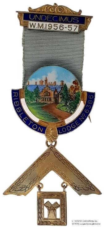ЗНАК: серебро, позолота, эмаль.АВЕРС: знак из двух частей. Нижняя часть - в форме наугольника с подвеской квадратной формы, отображающей символическое изображение чертежа к 47 теореме из первой книги Евклида (теорема Пифагора). Наугольник равносторонний, украшенный гравировкой орнамента по периметру. Верхняя часть, выполняющая так же роль нижней колодки, в форме круга с картиной по эмали, обрамлённого снизу лентой с наименованием и номером Ложи.РЕВЕРС: клейма: наугольник – TK&S, якорь, лев, Y (1973). Гравировка: Presented to W. Bro. T. Moorcroft W.M. 1956-57.КОЛОДКИ/МЕДАЛЬОН: верхняя колодка в виде двух прямоугольников с надписью на латыни: Undecimus, наименованием должности (W.M.) и даты 1956-57. Верх колодки украшен орнаментом.ЛЕНТА: голубая. Ширина 32 мм.