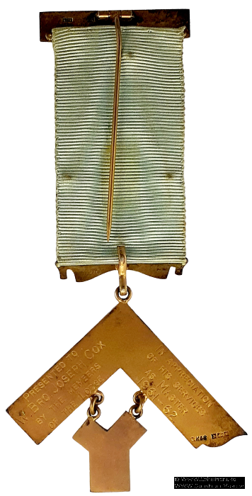 РЕВЕРС: клейма: наугольник – TK & S. Якорь, лев, N (1962). Верхняя колодка - лев, N. Гравировка: Presented to W. Bro. Joseph Cox by the Members of the lodge. In Appreciation of his Services as Master 1961-62.