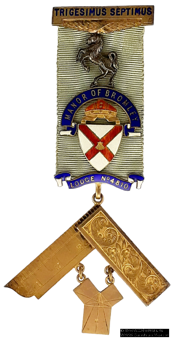 КОЛОДКИ/МЕДАЛЬОН: верхняя колодка в виде прямоугольника, украшенного снизу орнаментом и с надписью на латыни: Trigesimus Septimus. В верхней части ленты медальон в виде лошади на задних ногах – символ графства Кент. В нижней части медальон в виде герба Ложи с её наименованием Manor of Bromley - Поместье Бромли и номером на ленте, выполняющей роль нижней колодки - Lodge № 4810 - Ложа № 4810.