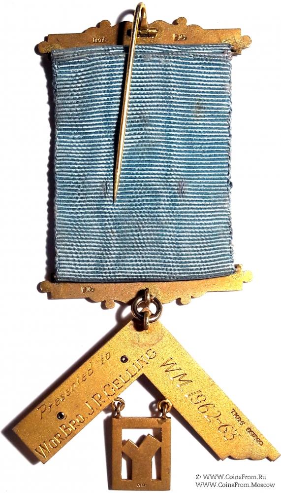 Знак Прошлому Досточтимому Мастеру Ложи BUKINGHAM LODGE № 591. Знак в форме наугольника с подвеской квадратной формы, отображающей символическое изображение чертежа к 47 теореме из первой книги Евклида (теорема Пифагора). Одна из сторон наугольника с орнаментом, вторая утолщённая с с накладным столбом обвитым венком. Все элементы знака, включая кольцо, выполнены из золота 9 карат или 375 пробы, о чём свидетельствуют клейма производителя. Гравировка на реверсе знака: PRESENTED TO WOR. BRO. J.R. CELLING W.M.1962-1963- преподнесён уважаемому Брату J.R. CELLING Досточтимому Мастеру в 1962-1963 гг.