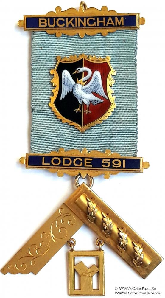 Лента небесно-голубого цвета. Верхняя колодка в виде прямоугольника в орнаменте с наименованием Ложи и иглой для носки. В центре ленты золотой медальон в виде чёрно-красного щита с изображением венценосного лебедя - герб Графства BUKINGHAMSHIRE (Историческое и церемониальное графство в центре Англии). Нижняя колодка аналогичная верхней с номером Ложи.