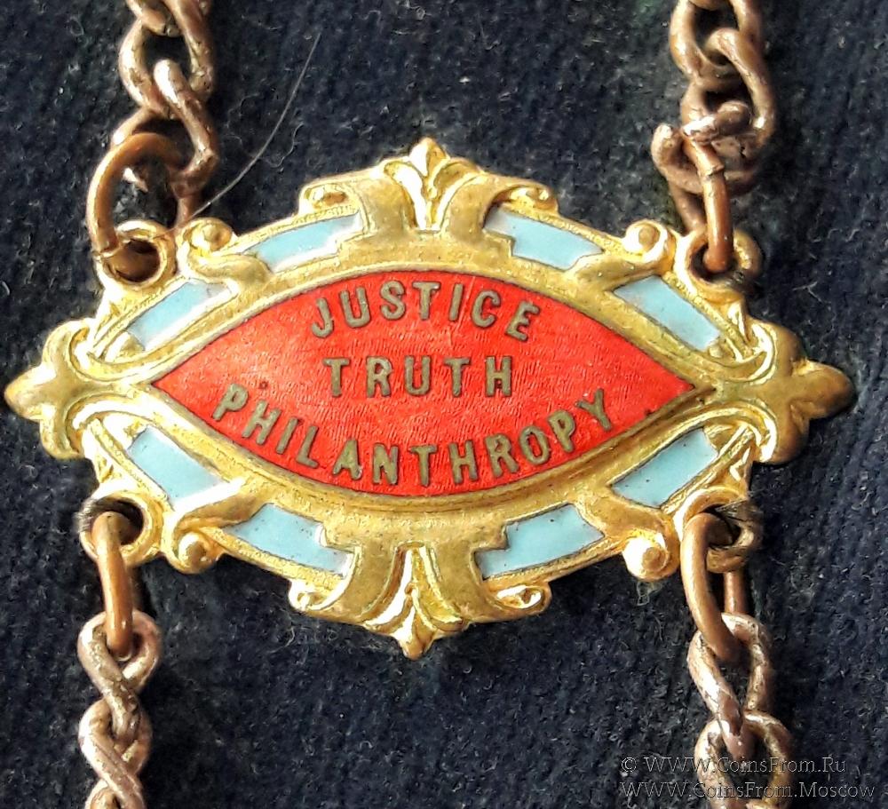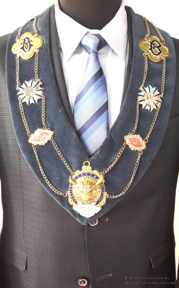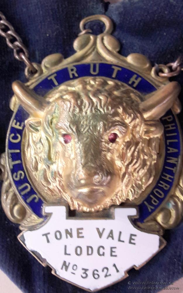 Медальон с головой буйвола 1-вверху и 1 большой внизу с надписью на белой эмали TONE VALE LODGE № 3621 и девизом Ордена по кругу на синей эмали JUSTICE * TRUTH * PHILANTHROPY– Справедливость Истина Человеколюбие. Есть ещё 2 медальона с этим девизом. Кроме того, 10 - лучевая мальтийская звезда – 2 шт.