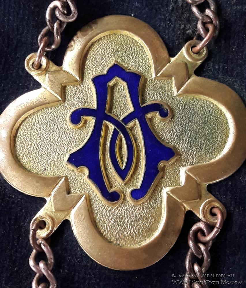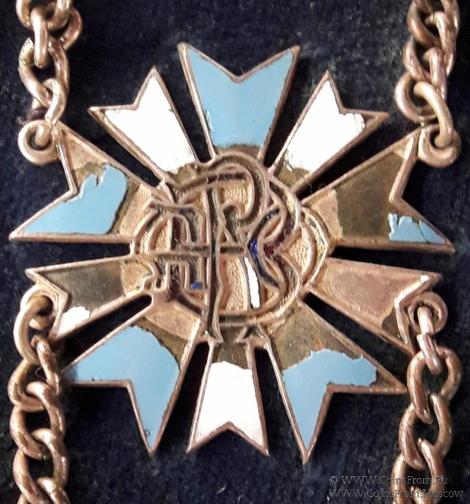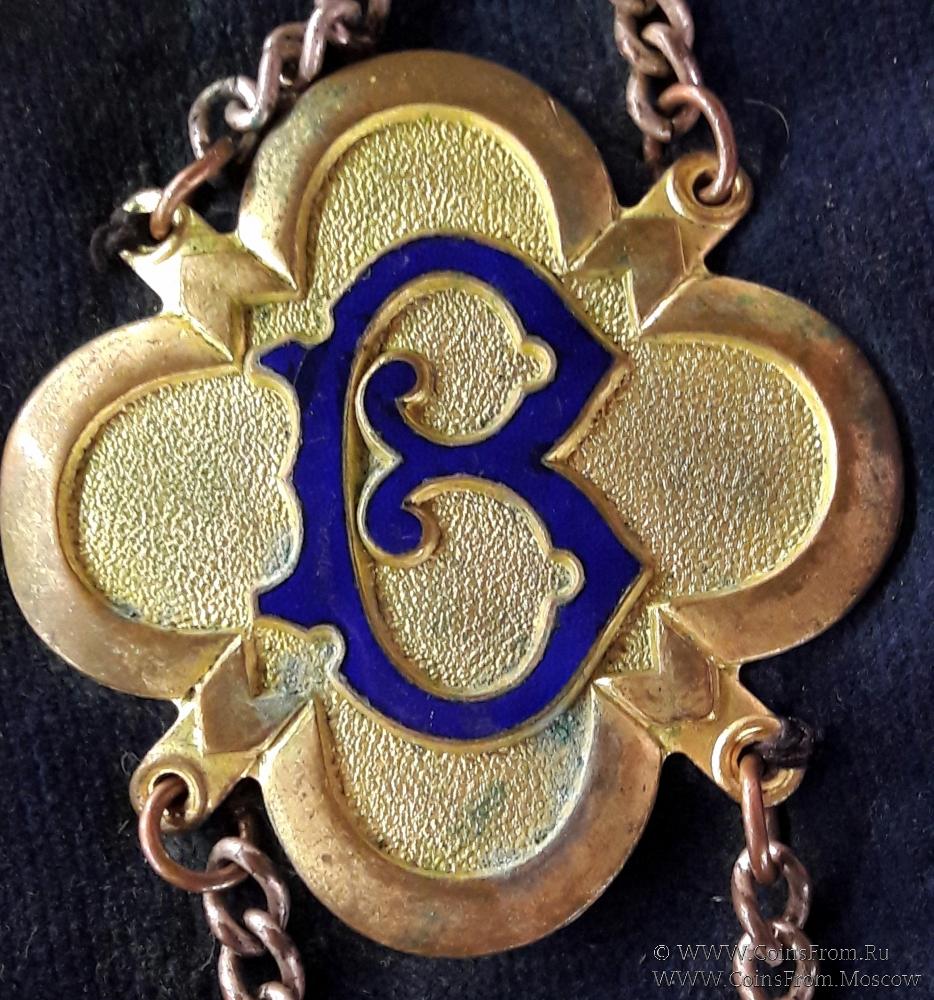 Нашейная церемониальная лента - это лента предназначенная, в первую очередь, для выделения офицеров и Великих офицеров от остальных братьев, она подчёркивает должность или Ранг носителя ленты. На данной ленте медальоны с буквами А, В показывают должность носителя ленты - Alderman of Benevolence - старший офицер по благотворительности в Ложе.
