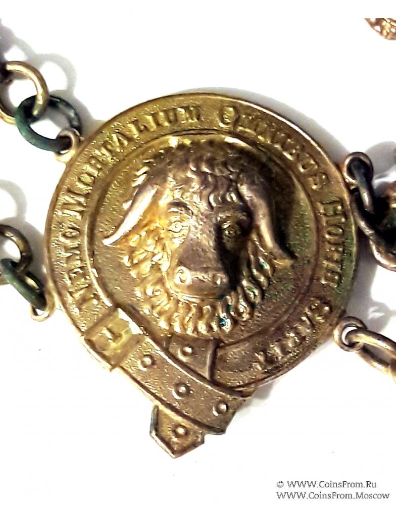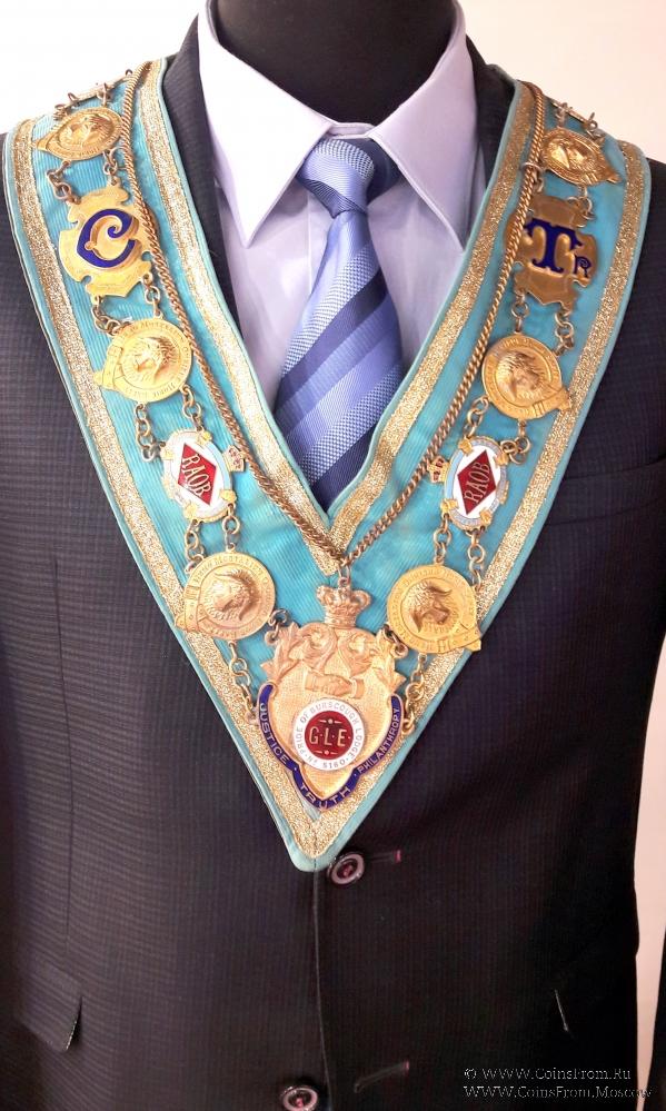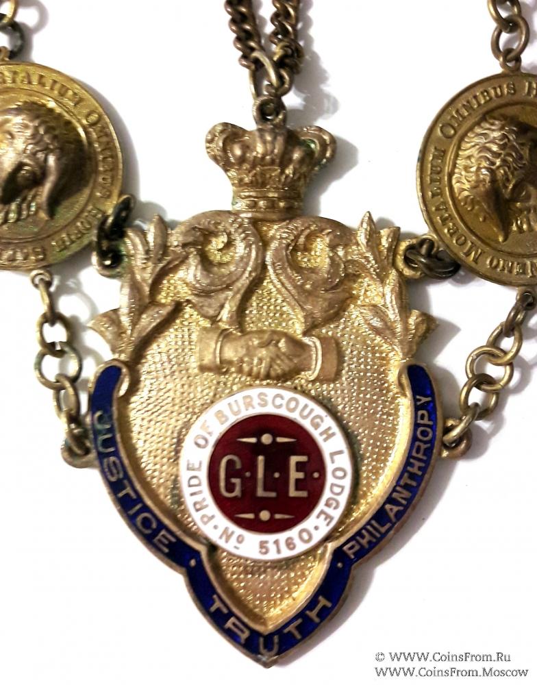 Цвет ленты бирюзовый. Лента объёмная. Коренной медальон в форме щита по низу медальона в синей ленте девиз ордена Justice Truth Philanthropy, в красно-белом круге надпись PRIDE OF BURSCOUGH LODGE № 5160 G.L.E. гордость Берско ложа 5160 Англия, над кругом рукопожатие над которым символические ветки увенчанные короной – 1 шт.