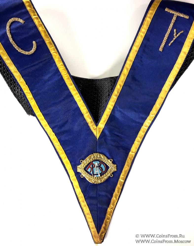 По центру ленты золотошвейные вышивки букв C, Ty - City Tyler– Городской тайлер (Привратник) - название должности в Ложах Ордена RAOB.