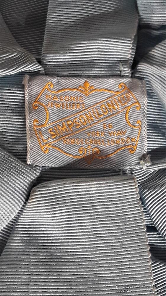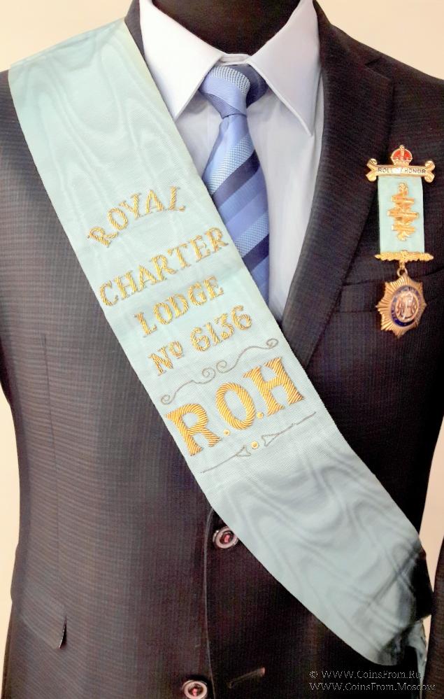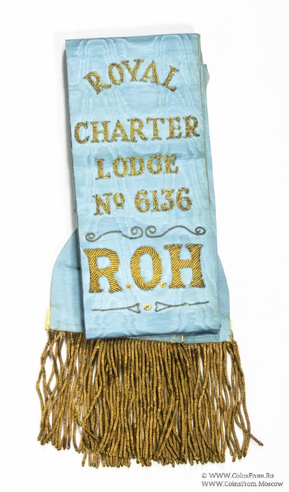 Низ ленты отделан бахромой золотого цвета. На стыке ленты золотого цвета медальон, пришитый за 4 кольца по форме идентичный знаку Ордена «Свиток Чести». В центре медальона аббревиатура Ордена (RAOB). Вокруг в синей эмали надпись PALMA NON SINE PULVERE (латынь) – пальма (первенства) не без труда.