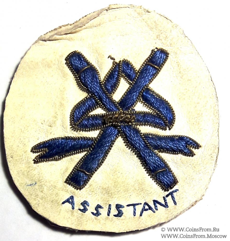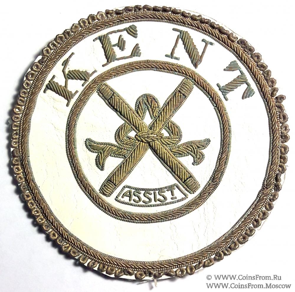 Нашивки провинции Кент помощника (ASSIST, ASSISTANT) Великого Провинциального Церемониймейстера (символ должности два жезла связанные лентой). На белом фоне золотошвейная вышивка на парадный запон Великого Провинциального Церемониймейстера, на синем фоне и шитьё синим шёлком с золотой оторочкой для повседневного запона Великого Провинциального Церемониймейстера.