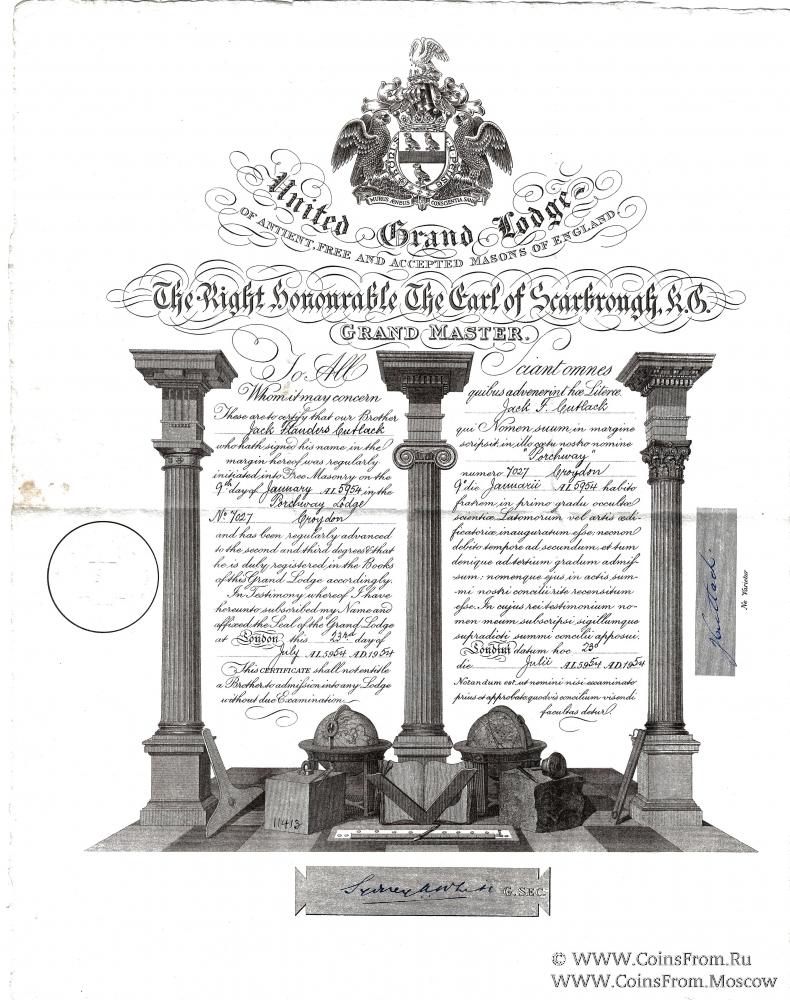Сертификат выдан Объединённой Великой Ложей древних, свободных и принятых масонов Англии о том, что Брат Jack Flanders Mutlack 9 января 1954 г возвышен в Ложе 7027 в Великие Мастера.