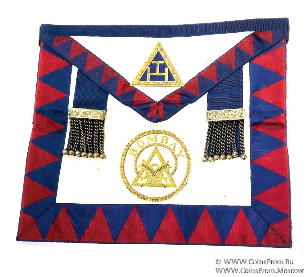 В нижней части запона золотошвейная вышивка - эмблема Великого Писца Капитула - два перекрещенных пера перевязанных лентой в равностороннем треугольнике. Эмблема заключена в круг с названием провинции - Бомбей.