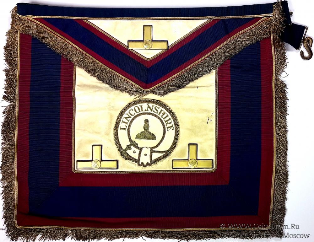 Запон из натуральной белой овчины-мерлушки. Запон белого цвета с треугольным клапаном ограничен по краю лентой тёмно-синего цвета с малиновыми краями и бахромой по краю. это говорит о том, что запон принадлежит офицеру Великой Провинциальной Ложи. На запоне расположены 3 элемента в виде двух перпендикулярных прямоугольников иногда называют ватерпасами) с изображением замкового камня по центру.