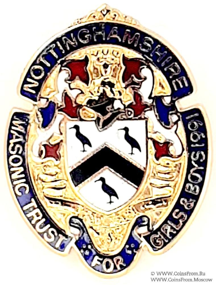 АВЕРС: В центре знака размещён герб, состоящий из щита, намёта, клейнода на бурелете и девизной ленты. На щите размещено «стропило» чёрного цвета, выше и ниже которого изображены птицы. Намёт красно-белого цвета. На щите в качестве навершия – шлем, на котором на бурелете размещён клейнод в виде поясной фигуры человека в короне. На девизной ленте написан девиз из двух слов на латыни. Герб окружён лентой синей эмали с наименованием провинции и благотворительного учреждения. Masonic Trust for Girls&Boys 1991 Nottinghamshire.