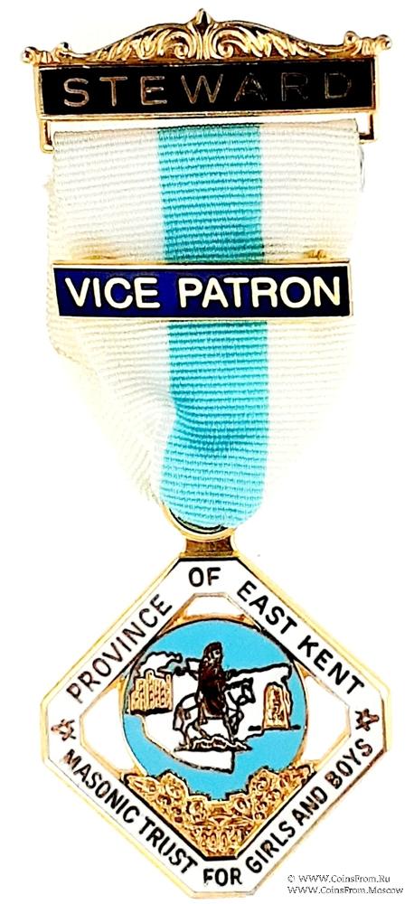 АВЕРС: в форме равностороннего ромба с усечёнными вершинами. По периметру наименование фонда (The Masonic Trust for Girls and Boys) и провинции (Province of East Kent – графство в юго-восточной части Англии). В центре ромба рисунок по эмали, изображающий всадника на фоне силуэта графства.
