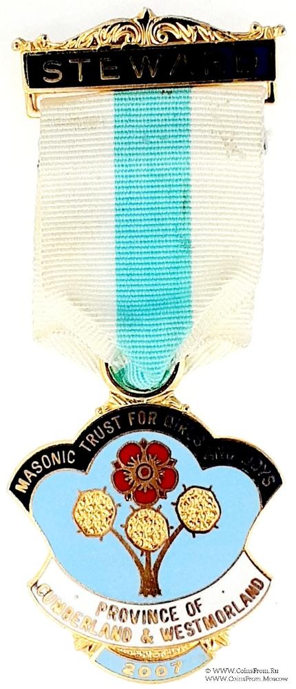 АВЕРС: в форме букета цветов, перевязанного лентой с наименованием провинции (Province Cumberland & Westmorland) Cumberland - графство на севере Англии. Westmorland — бывшее графство Англии, на полуострове Камберленд. По новому административному делению их территория вошла в состав церемониального графства Камбрия. В центре изображение букета из четырёх цветов: трёх жёлтых и одного красного. Три цветка символы на флаге Cumberland. В верхней части знака на ленте наименование фонда (The Masonic Trust for Girls and Boys).