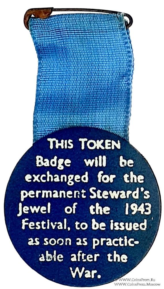 РЕВЕРС: надпись: This token Badge will the Exchanged for the Permanent Steward’s Jewel of the 1943 Festival, To be issued as Soon as Practicable Alter the War. (Этот символический значок будет обменен на постоянную драгоценность стюарда фестиваля 1943 года, которая будет выпущена, как только появится возможность изменить войну.).