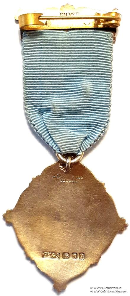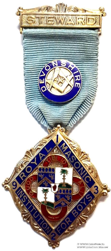 КОЛОДКИ/МЕДАЛЬОН: верхняя колодка с надписью Steward сверху украшена орнаментом. В центре ленты медальон круглой формы с наименованием провинции (Devonshire) и с наугольником и циркулем в центре.