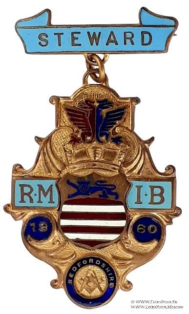 АВЕРС: в виде малого герба провинции. Щит с красно-белыми горизонтальными полосами и изображением льва на главе щита. Щит пересекает лента с аббревиатурой благотворительного заведения – RMIB. По бокам щита в кругах дата 1960. В нижней части знака двойной круг с наименованием провинции (Bedfordshire) и масонской символикой в центре. Над щитом корона с красно-синим драконом.
