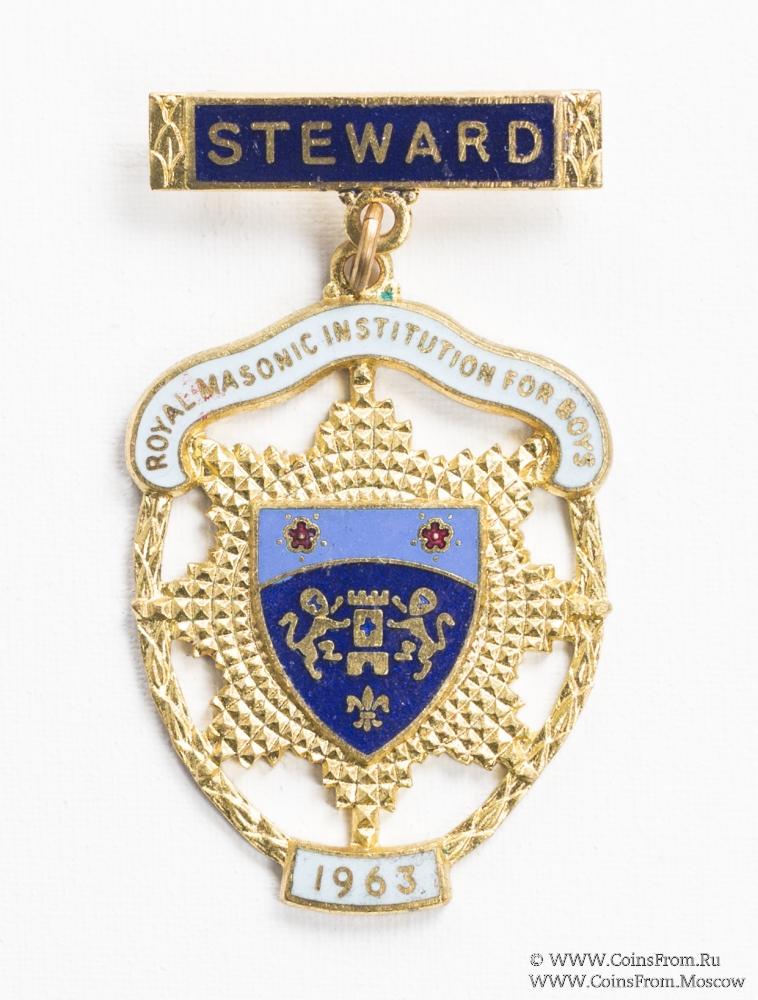 Колодка синей эмали с надписью STEWARD и булавкой для ношения с обратной стороны.