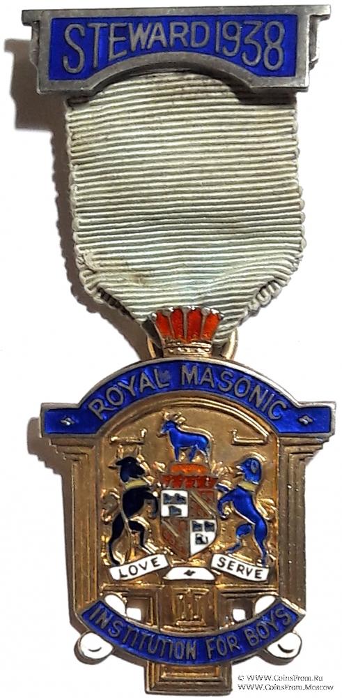 Колодки/медальон: верхняя колодка, по форме напоминающая арку, тёмно-синей эмали с надписью STEWARD и датой (1938). Булавка для носки с обратной стороны.