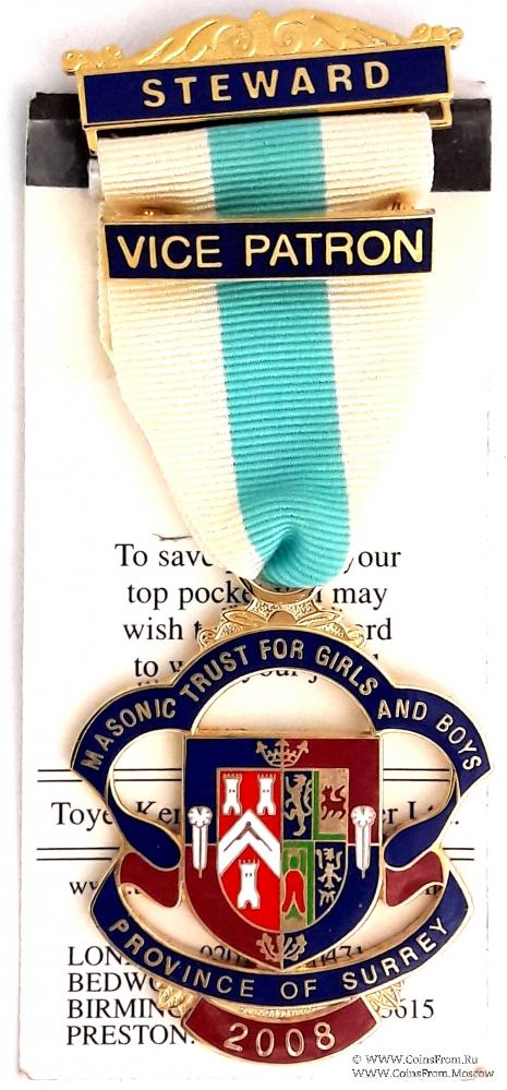 Знак в виде малого герба Великой Ложи Англии в виде щита с дополнительными полями сине-бордового цвета вокруг. На дополнтьельных полях слева и справа перья страуса, в низу дубовые листья, вверху корона с тремя перьями. малый герб окружён извилистой лентой синей эмали с обратной стороной красного цвета. На синем фоне ленты надпись с наименованием фонда Masonic Trust for Girls and Boys. В тнижней части лент название провинции в которой проводилось благотворительное мероприятие Province of Surrey. В самом низу знака на ленте красной эмали дата 2008.