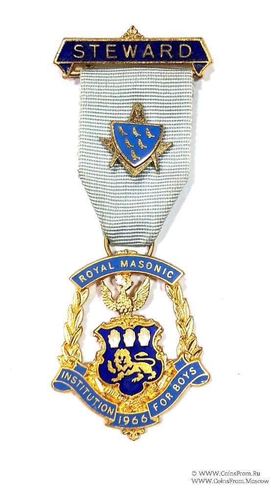 Цвет ленты голубой. В центре ленты металлический медальон в виде щита на фоне наугольника и циркуля. Щит синего цвета с изображением 6 птиц – символ провинции West_Sussex За́падный Су́ссекс — церемониальное неметропольное графство на юге Англии. Верхняя колодка в виде ленты синей эмали. По синей эмали надпись STEWARD.