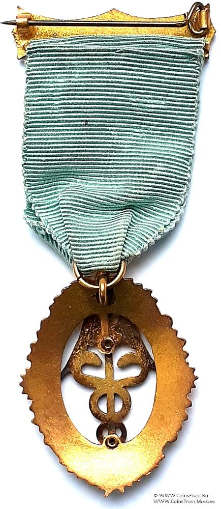 Овал синей эмали с названием учреждения THE ROYAL COMMERCIAL TRAVELLERS SHOOLS PINNER, окружённый венком. Внутри оплетённый змеями золотой жезл с крыльями и наконечником в виде шара – символ, пришедший из глубокой древности. Таинственный жезл носит название кадуцей.