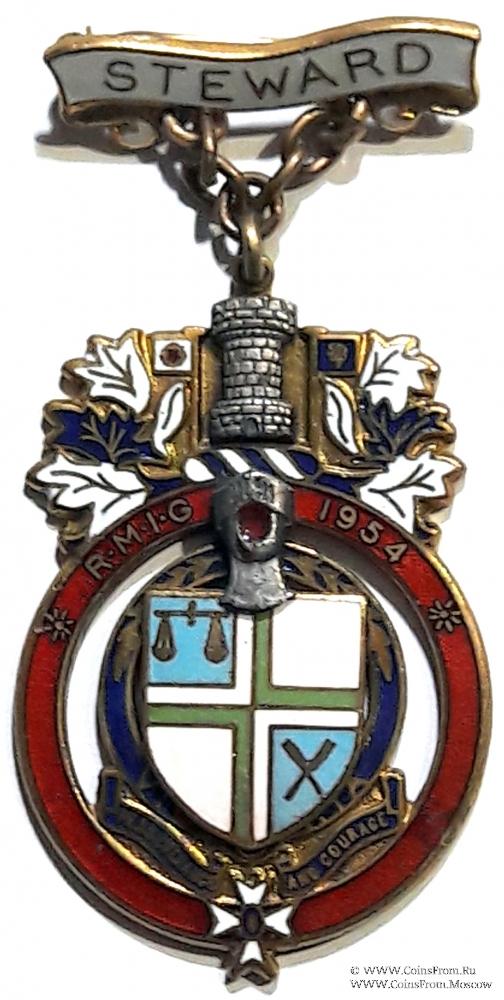 Круг красной эмали с надписью RMIG 1954. В круге средний герб в виде щита, шлема, навершия и намёта. Щит разделённый четверочастно имеет две белые четверти и две голубые с символами. Под щитом лента с девизом на латыни PERSEVERANCE AND COURAGE – упорство и мужество. В центре девизной ленты подвеска в виде мальтийского креста. Над щитом рыцарский шлем с забралом. Серебряный шлем с поднятым забралом, повёрнутый прямо - для баронетов и рыцарей. Выше на чёрно-белом бурлете клейнод (навершие) в виде башни крепостной стены, к которой крепится кольцо. Вокруг башни намёт в виде стилизованных листьев дуба и по флагу с каждой стороны. Один из флагов имеет в центре Алую розу Ланкастеров — геральдический символ Ланкашира и Ланкастеров.