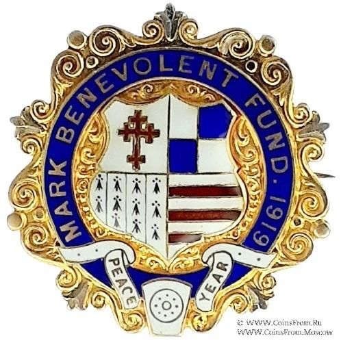 АВЕРС: двойной круг синей эмали с наименованием фонда и даты 1919. В центре малый герб в виде щита. По внешнему кругу украшения в виде орнамента. Нижняя часть знака украшена замковым камнем и белой лентой с надписью «Год мира».
