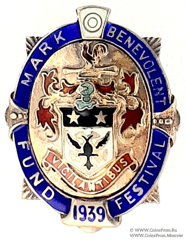 АВЕРС: в форме овала из ленты с наименованием фонда - Mark Benevolent fund и надписью – Festival. В нижней части знака на пластине дата - 1939. Вверху на ленте замковый камень. Боковые стороны овала украшены трилистником. В центре изображение герба в виде щита со шлемом, девизной ленты, намёта и клейнода в виде изображения петуха. На щите изображение двуглавого орла и двух звёзд на главе щита. Надпись на девизной ленте: Vicilantibus.