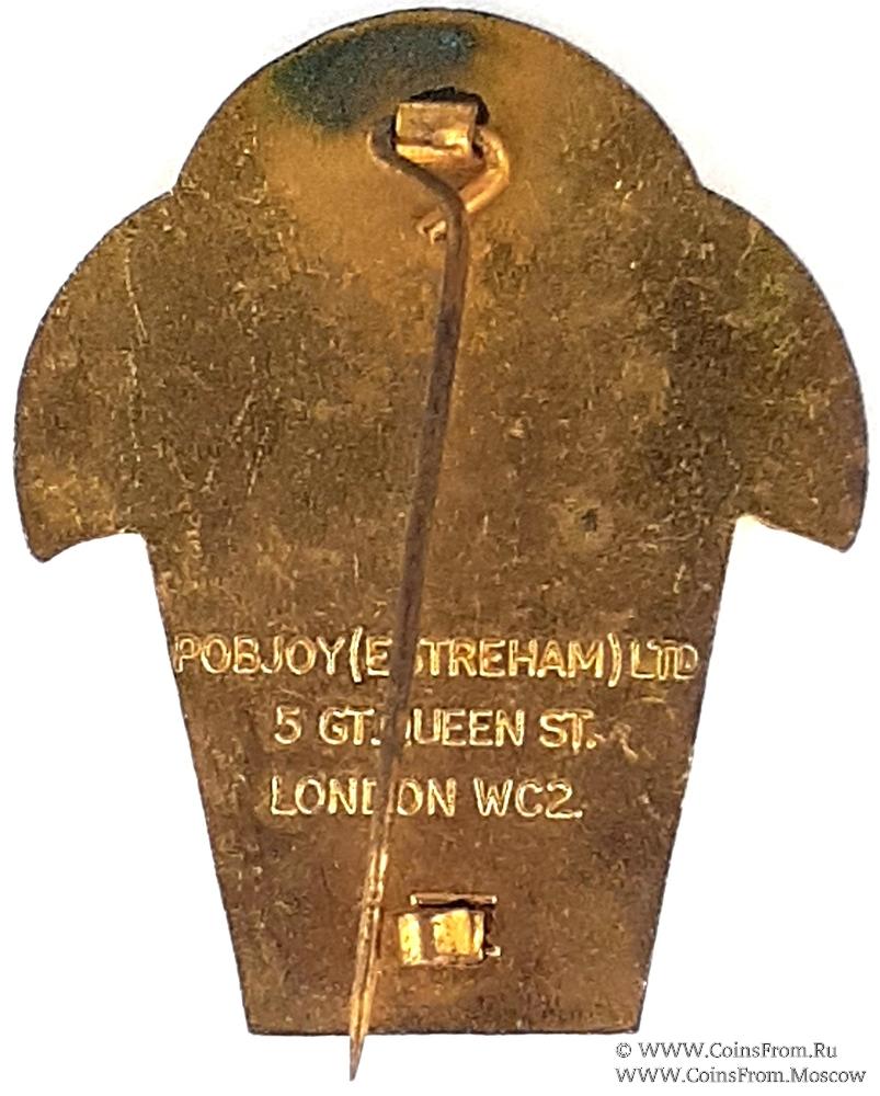 РЕВЕРС: вертикальная булавка для ношения. Без гравировок. Клеймо производителя – 71. Pob. Joy (Estreham) 5 GT. Queen St London WC2. Год выпуска: 1972. Лондон.