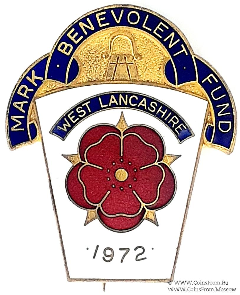 АВЕРС: в виде замкового камня белого цвета с красной розой в центре – символ Lancashire. Над розой название графства West Lancashire. Выше замкового камня на ленте наименование фонда - Mark Benevolent Fund.