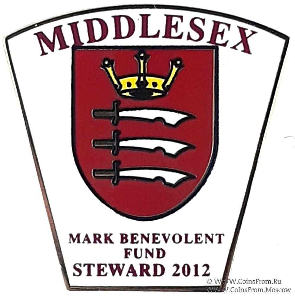 АВЕРС: в форме замкового камня малого герба в виде щита с символикой графства Middlesex (три коротких меча – сакса). Ниже щита наименование фонда (Mark Master Mason), надпись Steward и дата 2012.